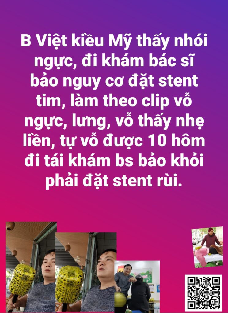 B Việt kiều Mỹ thấy nhói ngực, đi khám bác sĩ bảo nguy cơ đặt stent tim, làm theo clip vỗ ngực, lưng, vỗ thấy nhẹ liền, tự vỗ được 10 hôm đi tái khám bs bảo khỏi phải đặt stent rùi. – b Hoa