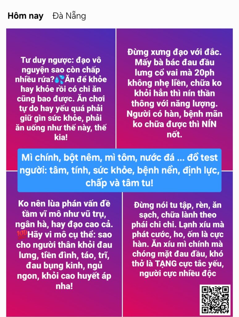 Rảnh là vỗ lưng, vỗ ngực, ấn bụng nếu muốn bao dịch, bao vac, ko sợ ốm, bệnh, đột quỵ, nghẹt mạch ống bên trong nha. Đập êm lâu. Bệnh của nay là do tắc hôm qua không thông. Bệnh của mai, mốt là do tắc hôm nay không thông, mỗi ngày gieo nhận cả tỷ duyên, đừng đổ cho 1 duyên vac á. Kết quả khỏe, bệnh là sự gặp của vạn duyên, đổ 1 duyên Nghe vô duyên lắm.