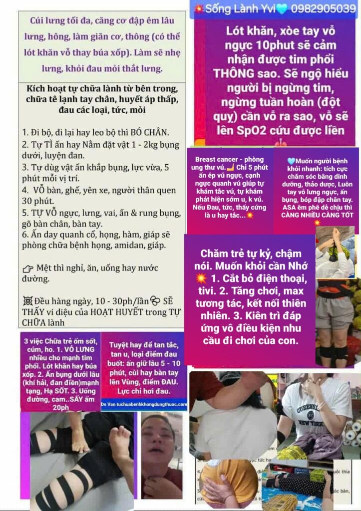 💙TỰ VỖ ngực, lưng thông mạnh tim phổi. Vỗ bằng búa xốp hay lót khăn tự vỗ bằng tay (khăn cho khỏi rát, xòe tay vỗ. Gõ bàn chân, bàn tay, cổ vai làm thông, kích hoạt. toàn thân.