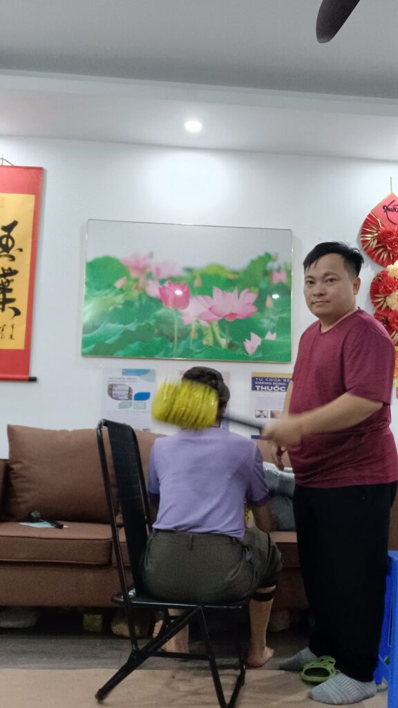 Mẹ la lên em chạy xuống thấy vậy em vừa lau mồ hôi vừa cầm khăn đập lưng, sau khi lau khô người em cầm búa xốp dài đập thì ba em dần có ý thức, đập lưng 15p thì ba em nhả người ra em mới đập ngực và đập toàn thân khoảng 30p thì ba em trở lại bình thường nhưng đo thấy huyết áp 128, nhịp tim 113, em cho uống nước đường, cạo ngực, bụng, sấy nóng thì nhịp tim trở về 85, huyết áp 121.