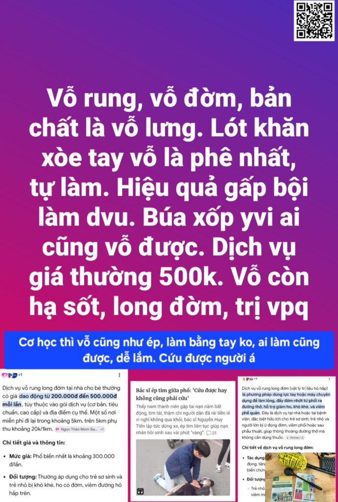 Vỗ rung, vỗ đờm, bản chất là vỗ lưng. Lót khăn xòe tay vỗ là phê nhất, tự làm. Hiệu quả gấp bội làm dvu. Búa xốp yvi ai cũng vỗ được. Dịch vụ giá thường 500k. Vỗ còn hạ sốt, long đờm, tiêu đờm giúp trị viêm phế quả, viêm tai, suy hô hấp, tăng spO2, THÔNG THOÁNG ĐƯỜNG THỞ vì THÔNG TIM, PHỔI MẠCH PHỔI, TIM.